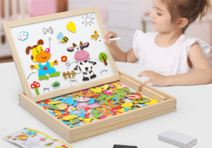 Caja Pizarra Doble Puzzle En Madera + Marcador Y Tiza