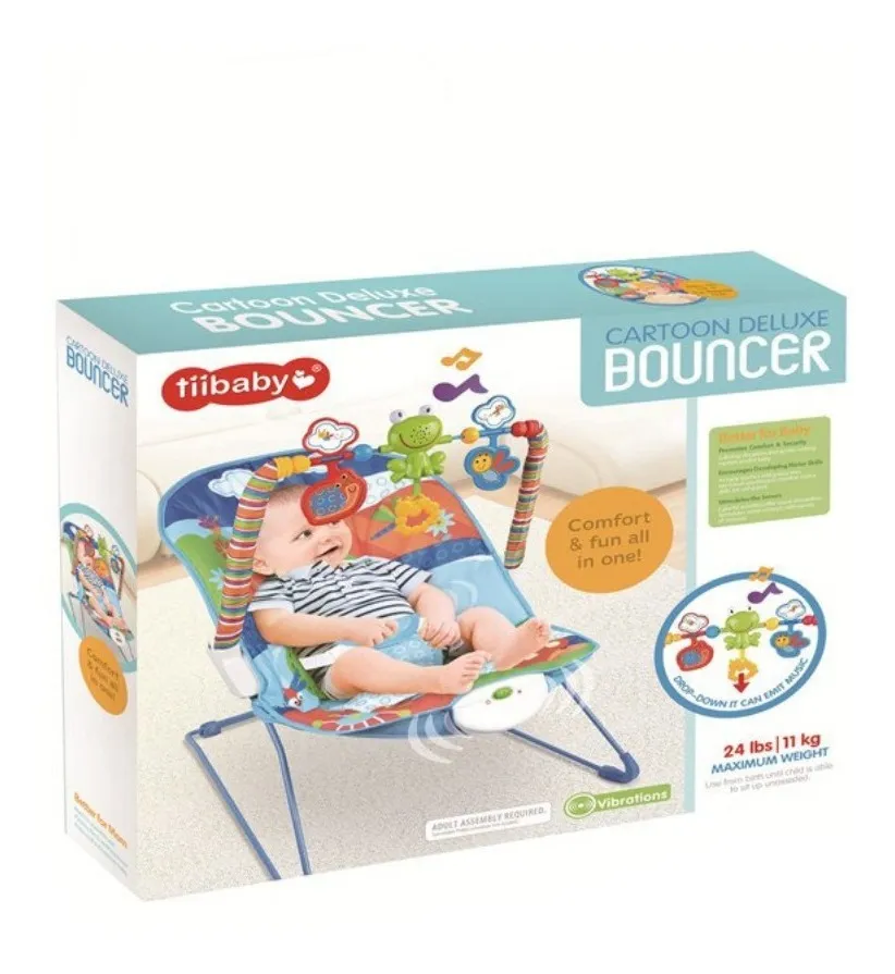 La mecedora Bouncer Tiibaby Cartoon Deluxe es ideal para el descanso y entretenimiento de los más pequeños, ofreciendo vibraciones calmantes para relajarlos y ayudar a dormir. Cuenta con una barra de muñecos colgantes que estimulan los sentidos del bebé y está diseñada con un moderno estilo. Su cinturón de seguridad de 3 puntos mantiene al niño protegido durante su uso, recomendado para bebés de 3 a 11 kg. Funciona con una pila D (no incluida). Además, sus patas antideslizantes garantizan estabilidad y seguridad. La barra de juguetes es desmontable, permitiendo al bebé jugar cómodamente. Este producto será una gran ayuda en su aventura de descubrir el mundo.