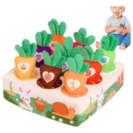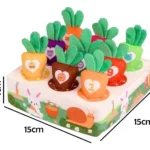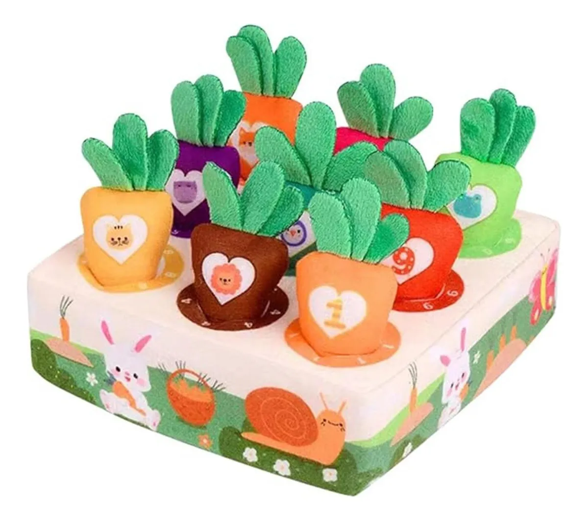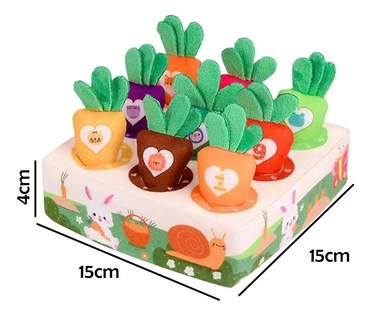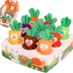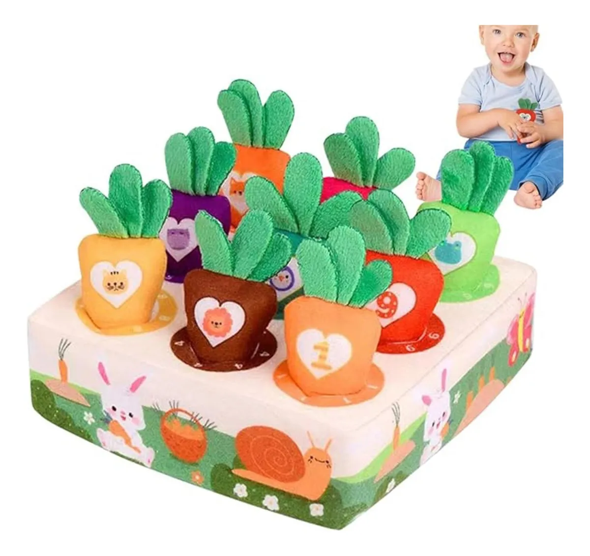 Cada zanahoria tiene números o dibujos que ayudan a introducir conceptos básicos como el conteo y el reconocimiento de colores y formas. Fabricado con materiales blandos y seguros para el bebé, este juguete es perfecto para jugar, aprender y divertirse de forma segura. Además, su diseño adorable lo convierte en una excelente opción como regalo educativo.