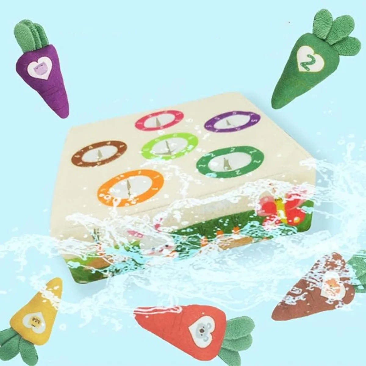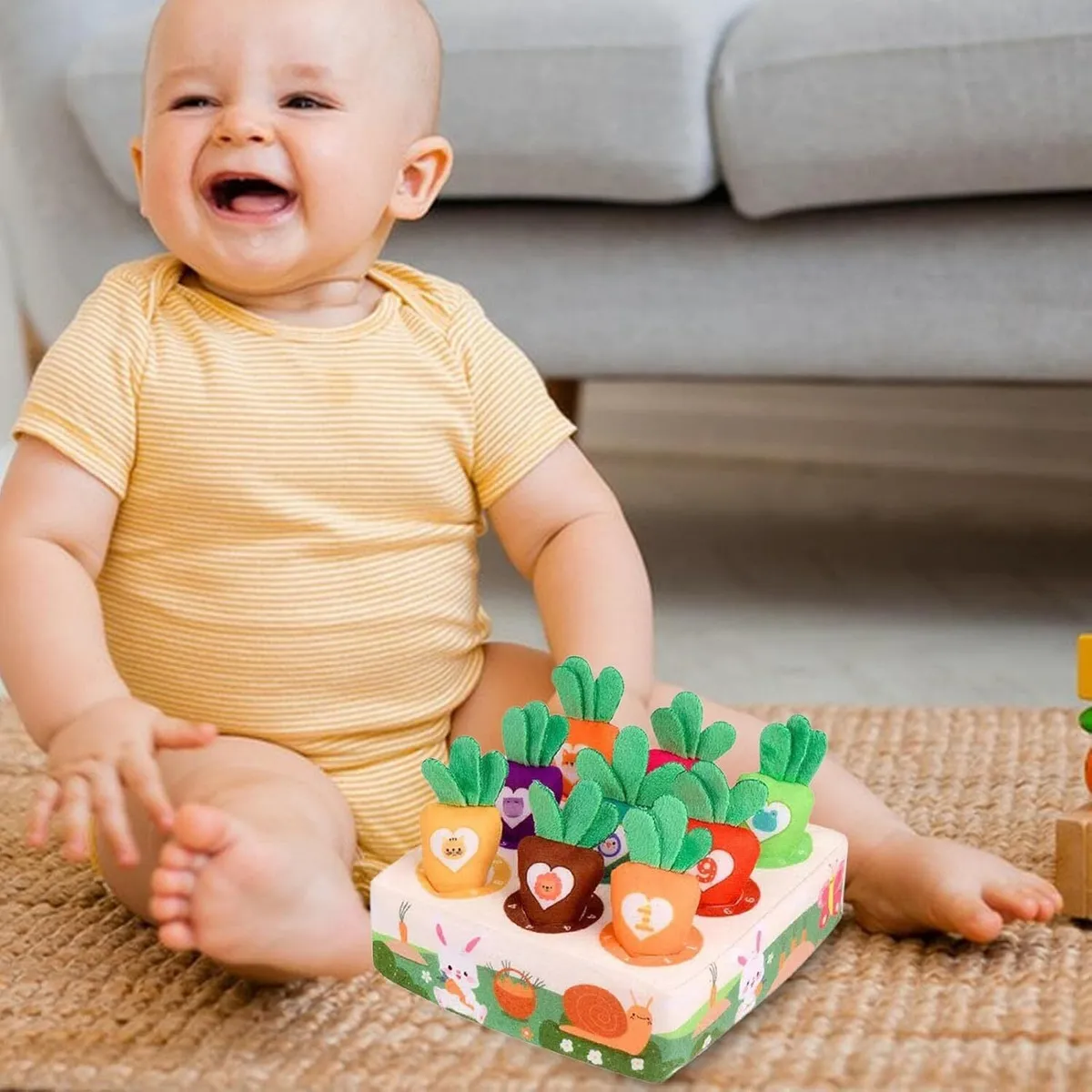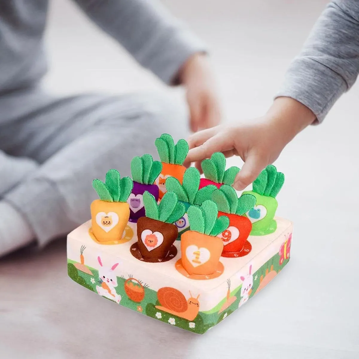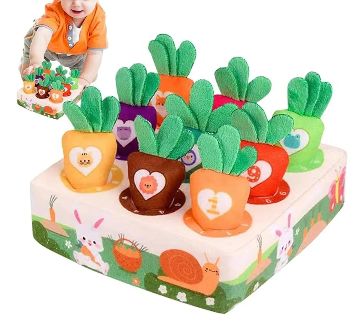 Cada zanahoria tiene números o dibujos que ayudan a introducir conceptos básicos como el conteo y el reconocimiento de colores y formas. Fabricado con materiales blandos y seguros para el bebé, este juguete es perfecto para jugar, aprender y divertirse de forma segura. Además, su diseño adorable lo convierte en una excelente opción como regalo educativo.