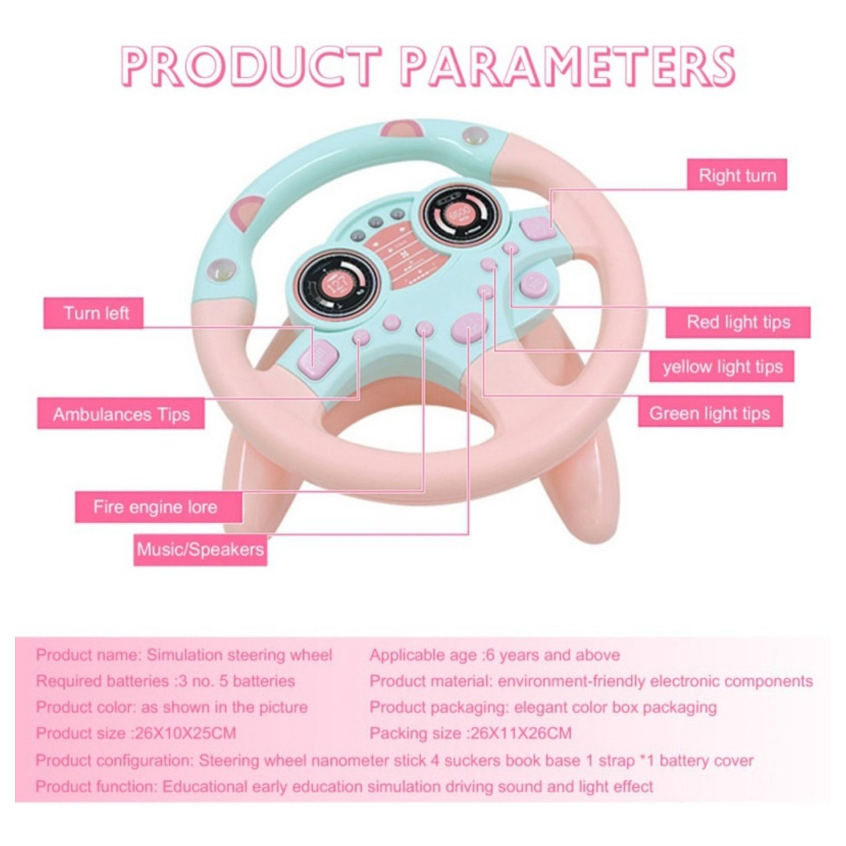 Este divertido volante de juguete es ideal para niños y niñas mayores de 3 años, ofreciendo una experiencia de juego realista y entretenida. Cuenta con ventosas que permiten adherirlo a paredes, mesas, pisos y otras superficies, garantizando estabilidad durante el juego.